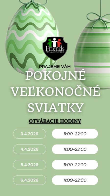 Vitajte v Friends Pizza & Restaurant, kde sa stretnú chute, priateľská atmosféra a radosť z jedla. Príďte si oddýchnuť, nasýtiť sa a zabaviť sa. Sme tu pre vás s úsmevom.